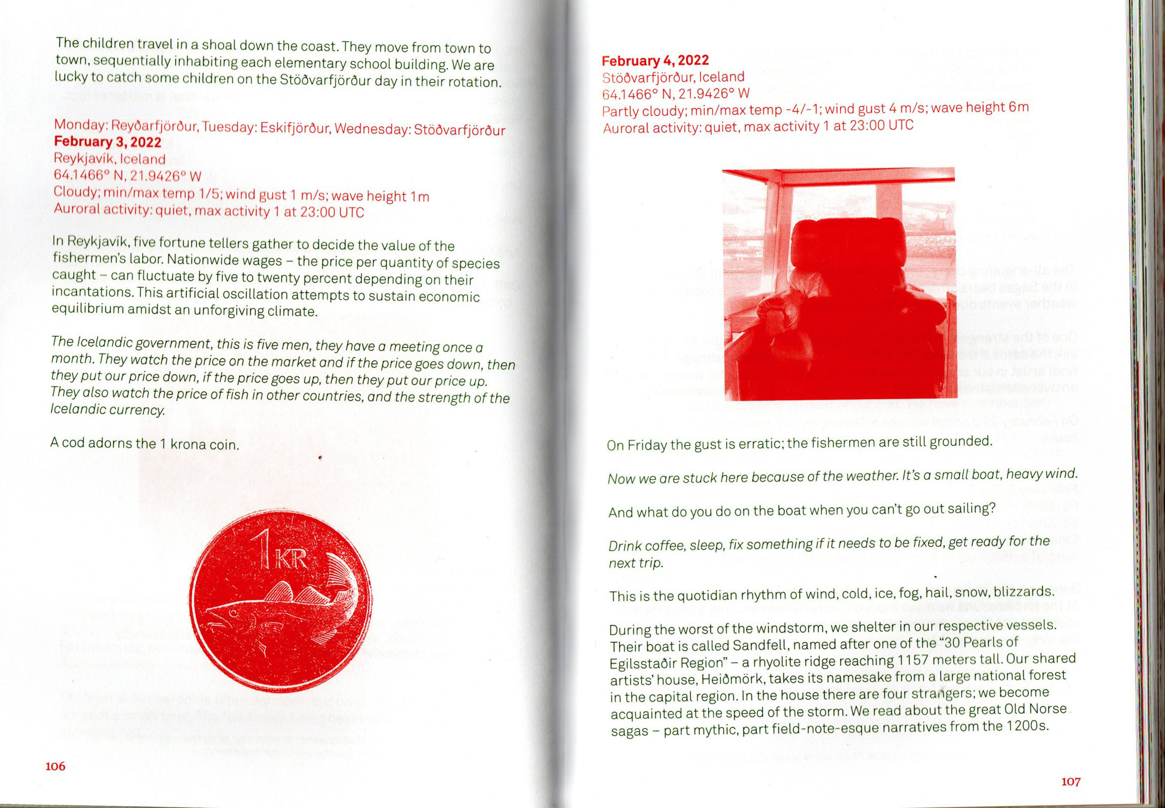Interested in the activation of collective memory, the exhibition investigates the capacity of subjective, sensorial ‘data’ to trace the relationships between icelandic fishing communities, non-human agents, and the conditions of our contemporary extractivist paradigm. In correlation with the museums location - the Marshall House at Reykjavik’s Old Harbor - ACT 1 is composed of publicly accessible live footage captured by the Faxaflóahafnir Associated Icelandic Ports’ webcams. Reflecting on these histories and the cyborg ‘memory’ produced by harbour webcams, the exhibition also encouraged a collective writing practice inviting visitors to participate in a retelling of the events engendered by a fundamental change in fishing legislation due to the Fisheries Management Act in 1990, which legalized privatization of the commons. Text adapted from exhibition text written by Kristina Stallvik and Nickie Sigurdsson, 2022.