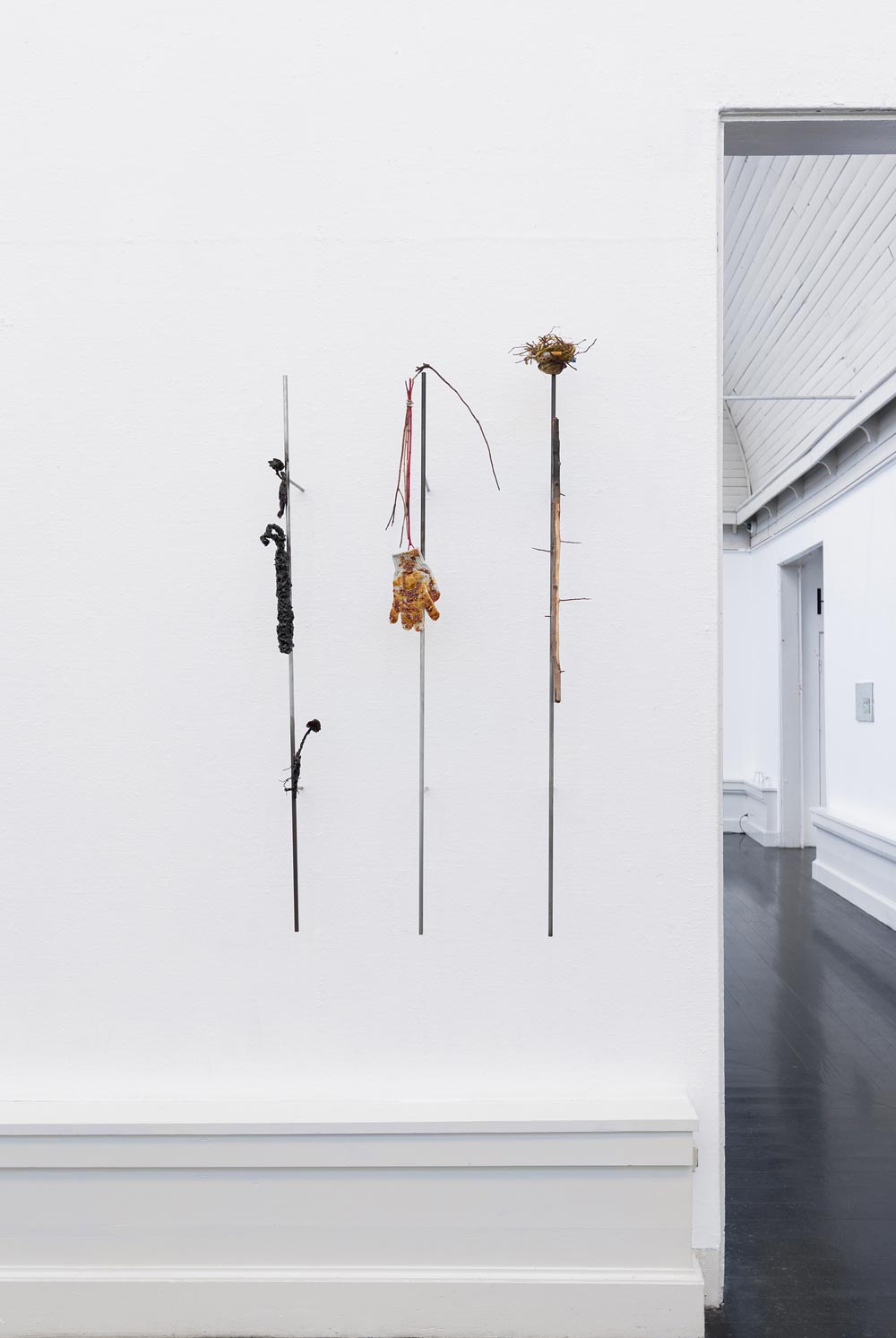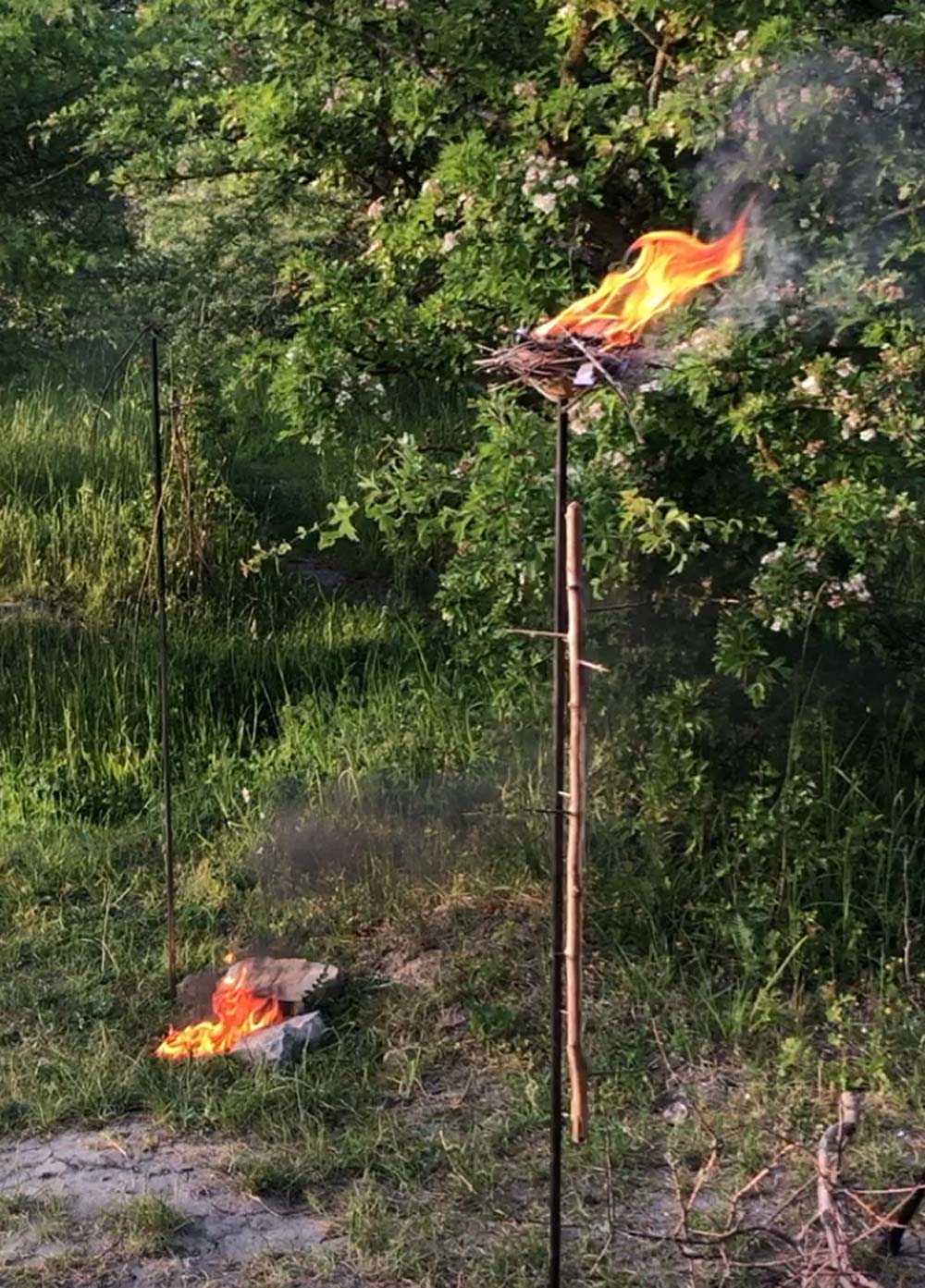 Referencing folk traditions–such as Nordic fertility rituals for cattle–the work explores how inherited rituals can facilitate a cyclical and reciprocal relationship with our surroundings and counteract some of the effects brought about by late capitalism. The inspiration for the work also draws from a fascination with online “prepping” videos, where individuals, often alone in nature, demonstrate various survival techniques. The sculptures thus seek to contrasts this individualism, and serve as tools for shared experiences, while inviting people to (re)claim common land as a historically rooted communal space.