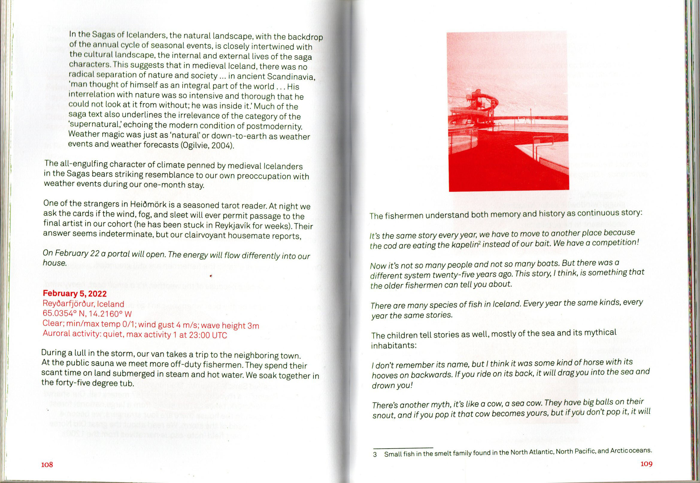 Interested in the activation of collective memory, the exhibition investigates the capacity of subjective, sensorial ‘data’ to trace the relationships between icelandic fishing communities, non-human agents, and the conditions of our contemporary extractivist paradigm. In correlation with the museums location - the Marshall House at Reykjavik’s Old Harbor - ACT 1 is composed of publicly accessible live footage captured by the Faxaflóahafnir Associated Icelandic Ports’ webcams. Reflecting on these histories and the cyborg ‘memory’ produced by harbour webcams, the exhibition also encouraged a collective writing practice inviting visitors to participate in a retelling of the events engendered by a fundamental change in fishing legislation due to the Fisheries Management Act in 1990, which legalized privatization of the commons. Text adapted from exhibition text written by Kristina Stallvik and Nickie Sigurdsson, 2022.